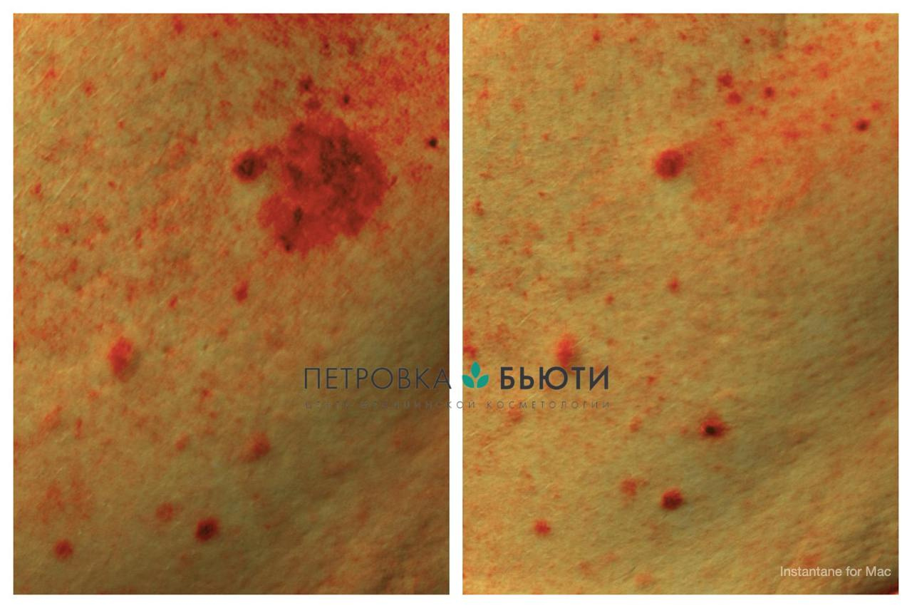 На фото до-после с диагностического аппарата Antera видно, что общий уровень меланина понизился на обработанном участке.