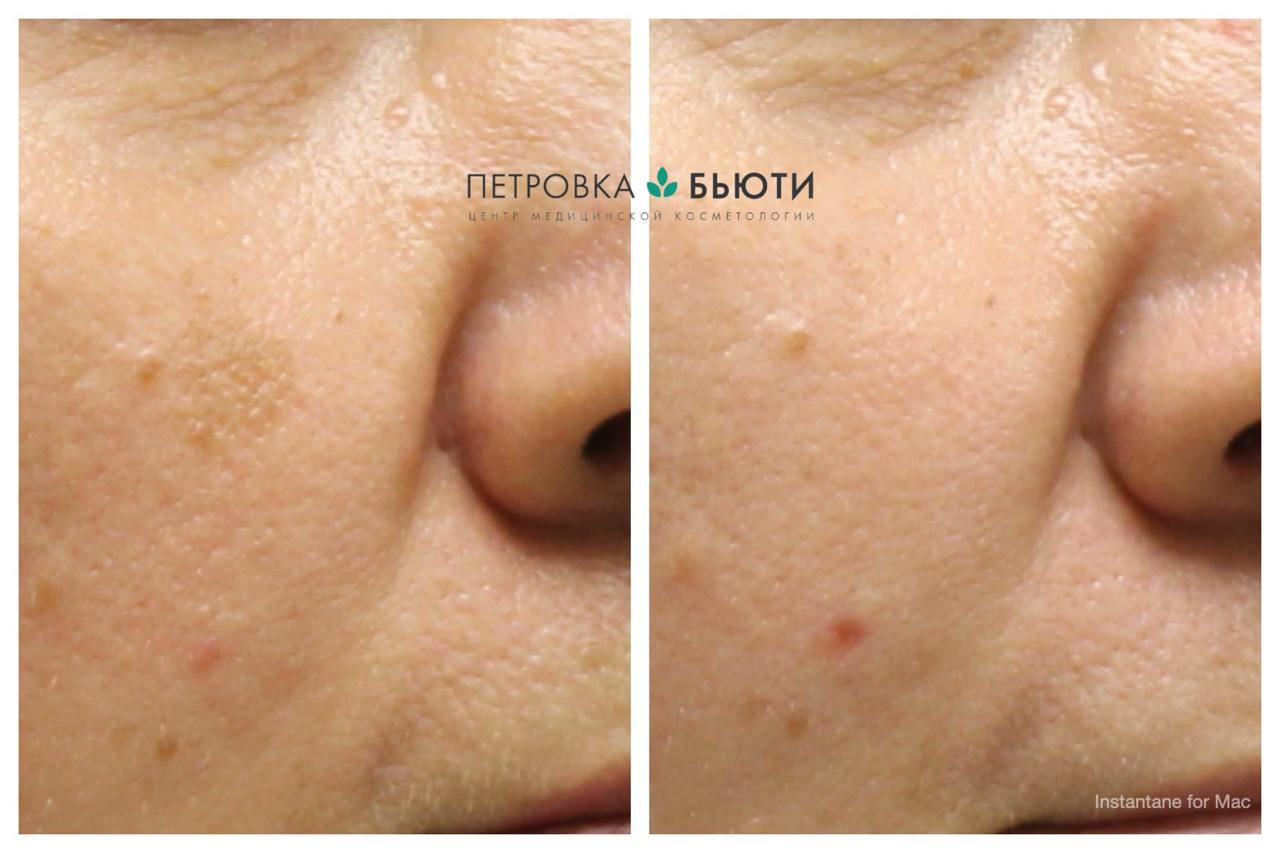 После удаления пигментное пятно заживало с образованием корки, появилась она на второй день, а через неделю отошла. Это нормальный процесс заживления. Пациентка использовала SPF-40 средство TiZO Ultra Zinc каждый раз перед выходом на улицу.