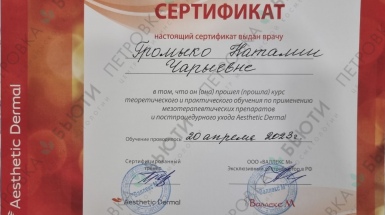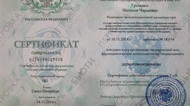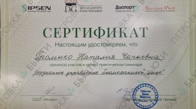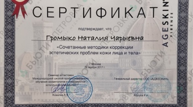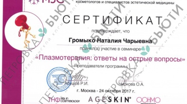 Громыко Наталия Чарыевна владеет современными эффективными безопасными средствами и методами аппаратной антивозрастной коррекции. Специализируется на диагностике и лечении акне, постакне рубцов, розацеа, пигментации, фото- и хроностарения, коррекции морщин, формы губ и объемной пластики лица инъекционными и аппаратными методами. Лазерная косметология является ведущим направлением врача.