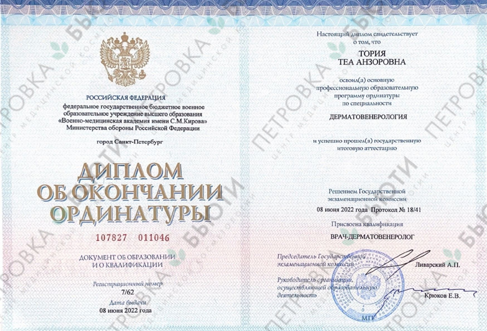 2022 - ординатура дерматовенерология, ФГБВОУ ВО "Военно-медицинская академия имени С.М.Кирова".