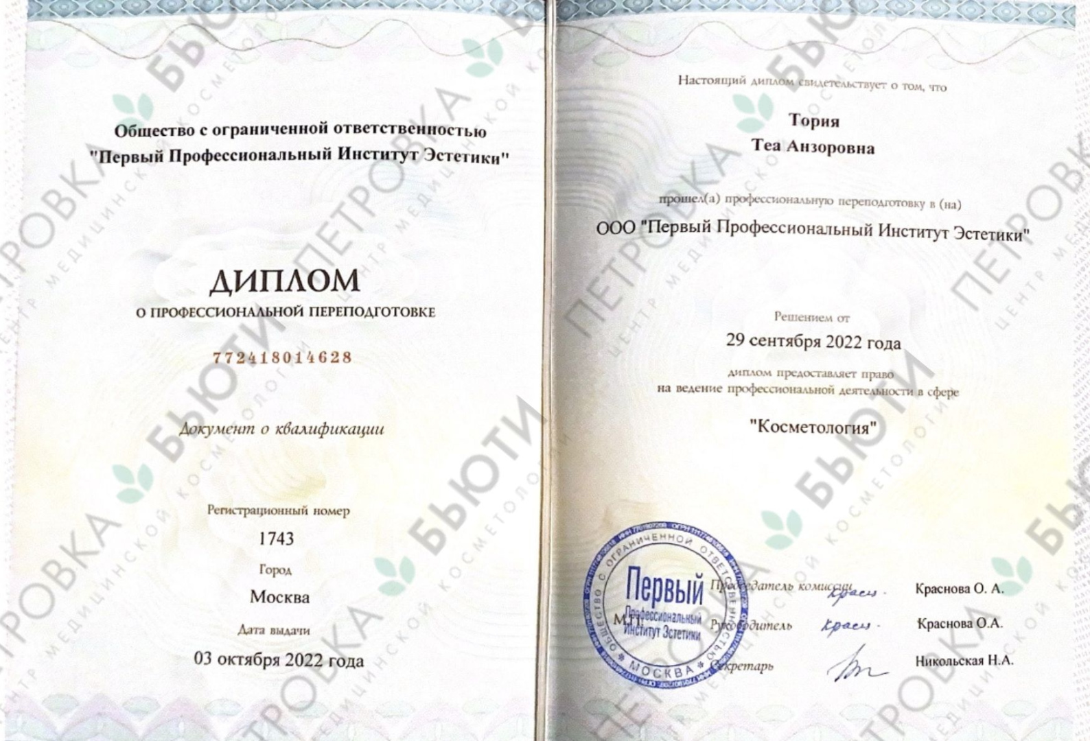 2022 - профессиональная переподготовка по специальности "Косметология", ООО "Первый Профессиональный Институт Эстетики".
