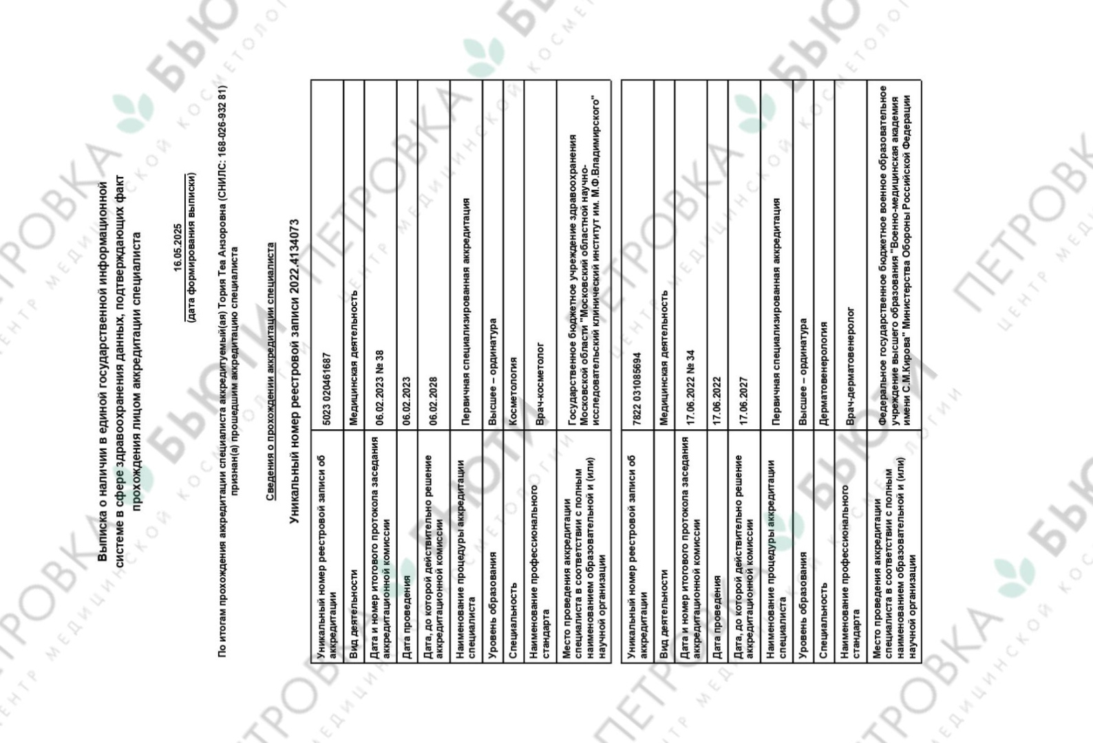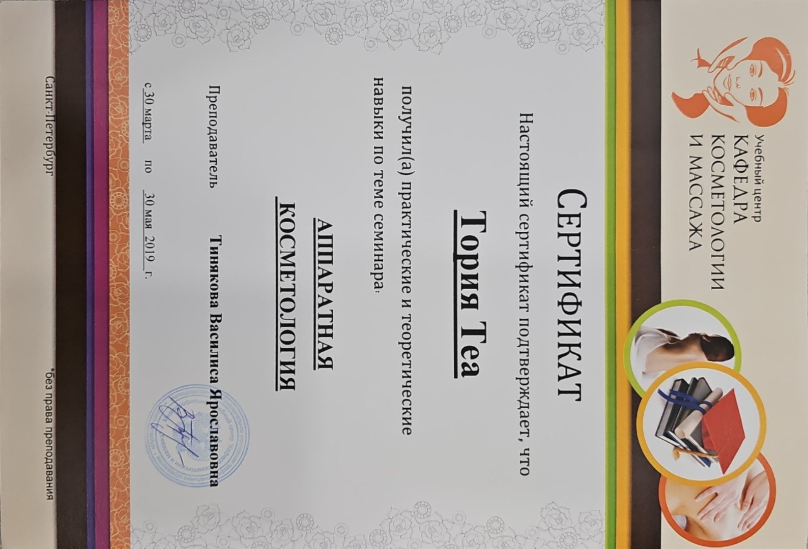 Тория Теа Анзоровна профессионально владеет аппаратными методиками лечения пигментации и сосудов, акне и удаления рубцов. Любит инъекционные методы и проводит ботулинотерапию, контурную пластику, биоревитализацию, и считает, что красивая кожа - это самое главное в привлекательности как женщин, так и мужчин.