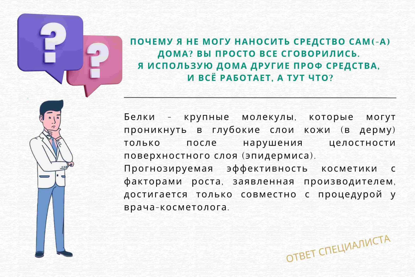проведены клинические исследования, поэтому рекомендовано наносить эти смеси на травмированную кожу. Так решается проблема доступа к глубоким слоям кожи, и ценные факторы роста работают гораздо эффективнее, чем при поверхностном нанесении.